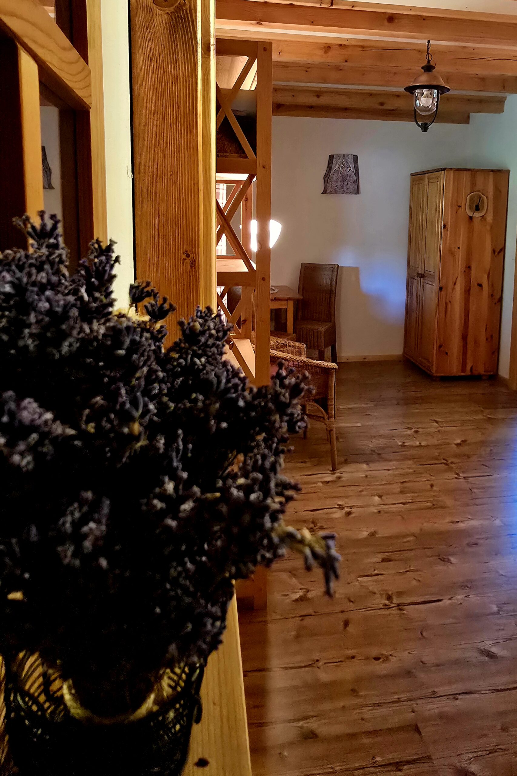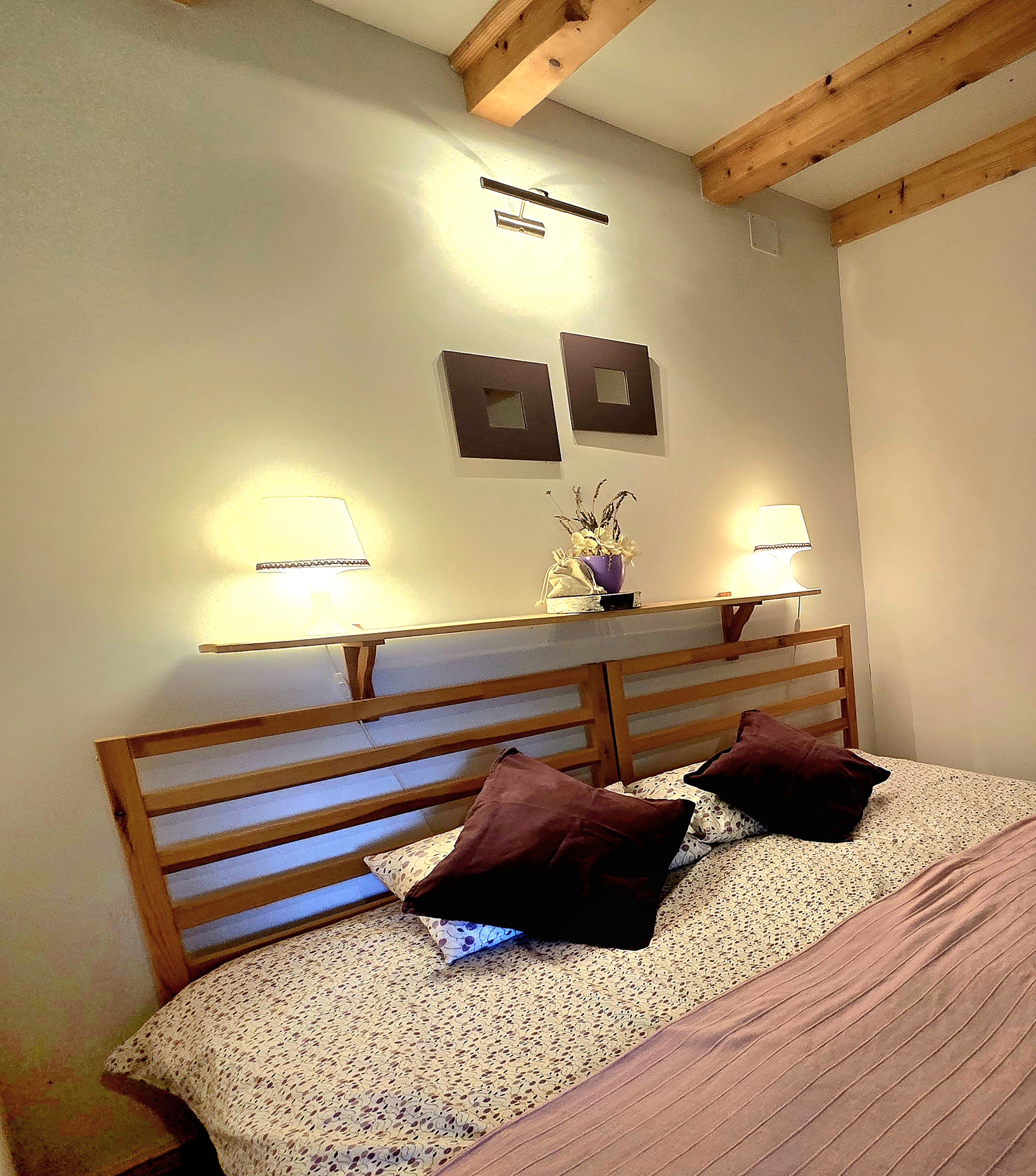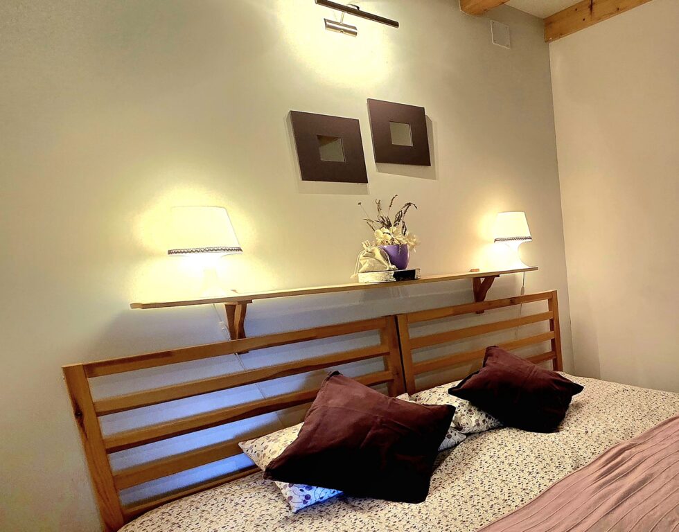 Pokój dwuosobowy z łazienką. Dwa łóżka pojedyncze mogą tworzyć łóżko małżeńskie. Pokój ma dostęp do tarasu na południową stronę z widokiem na góry. Śniadanie w cenie pokoju.